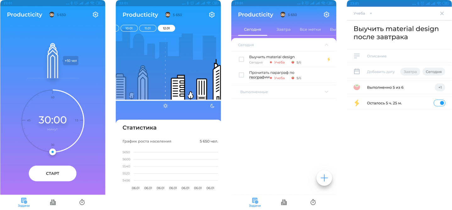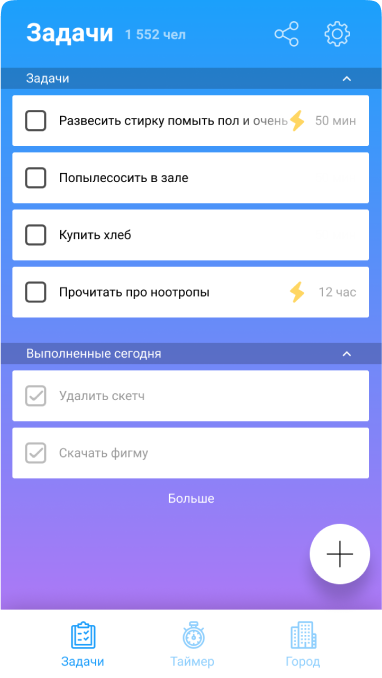 При выборе времени для таймера демонстрируем на сколько жителей пополнится город пользователя, и превью здания. В todo листе можно применить функцию автоудаления задачи через 24 часа, это должно смотивировать пользователя быстрее взять задачу в работу.