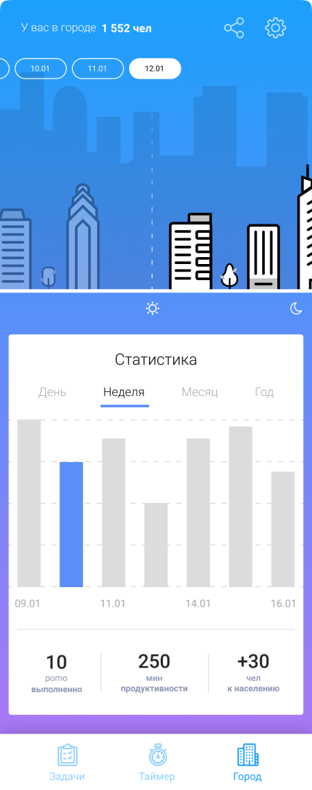 Персональный город пользователя строится после каждого выполненного pomodoro, деревья это отдых между задачами. А также есть более развернутая статистика по времени фокуса.